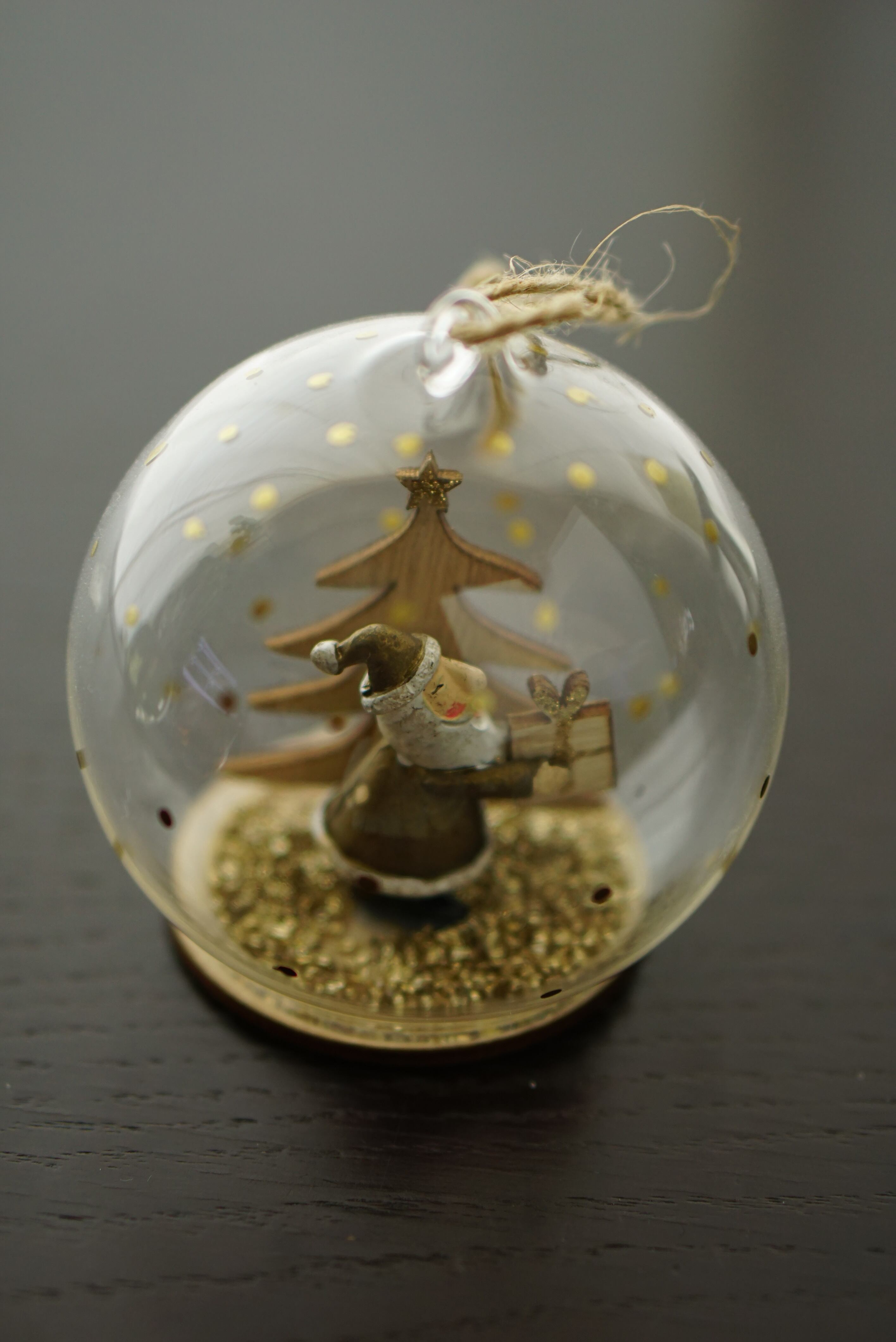 ガラス製のドーム内にツリーとサンタ。ゴールドのキラキラが綺麗です。